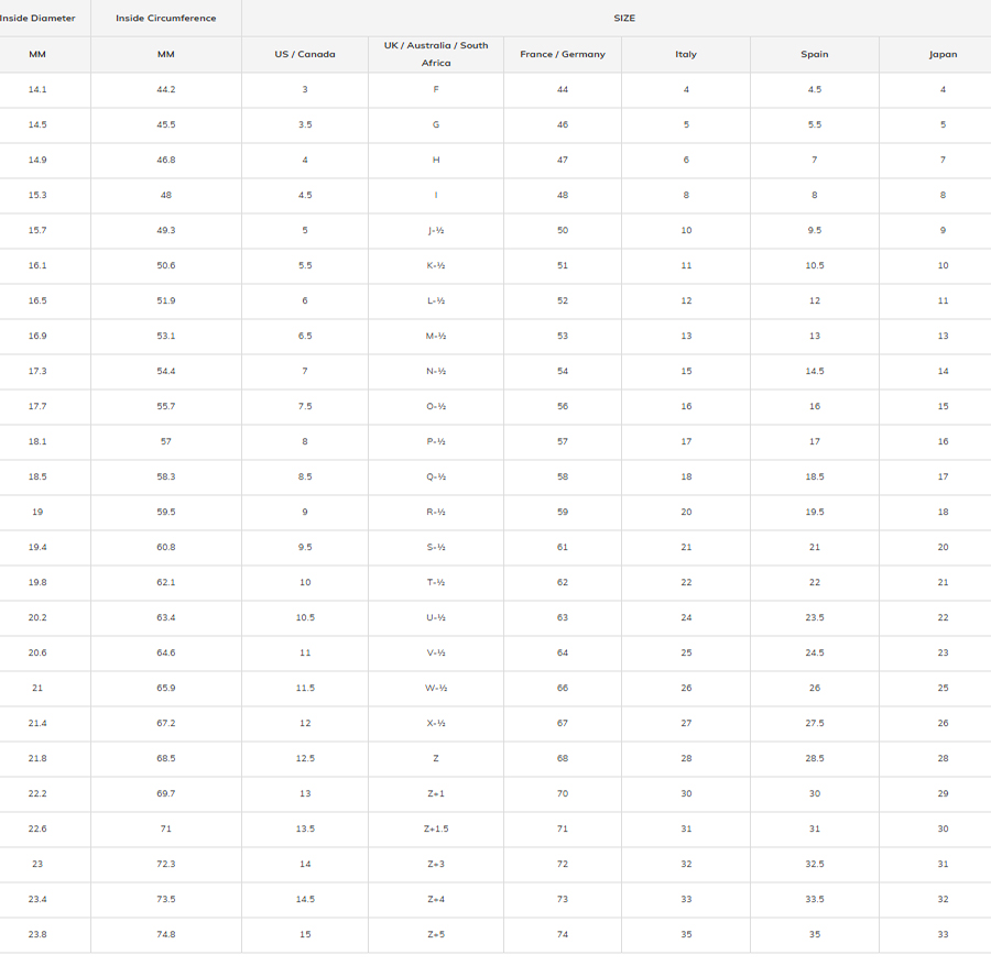 This is a chart that will be extremely helpful for you to determine the ring size that you need. You can either make use of a tape or a small piece of string to measure the area that will be occupied by the ring. When it becomes a complete circle, make a mark on such string. This will be helpful for you to compare with the chart that is mentioned below.