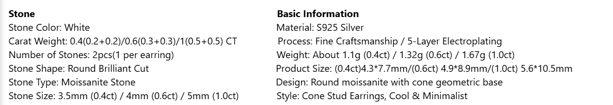 Modern, edgy and minimalist, these stud earrings feature a classic three-prong setting with a sleek cone-shaped base, equipped with 0.40ct, 0.60ct, 1.00ct round brilliant-cut lab-grown moissanite for options. Both main stone and side accents are genuine moissanite, crafted from S925 sterling silver with five-layer fine plating. The unique cone design shows personality and high-level sparkle, perfect for daily wear, street style, parties and gifting.