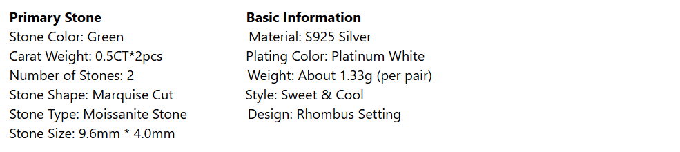 A striking blend of modern design and ethereal color, these stud earrings feature two 0.5CT marquise-cut blue lab-grown moissanite stones (4*8.0mm), held securely in sleek, polished S925 sterling silver settings. The elongated, eye-shaped cut and vivid teal-green hue create a mesmerizing sparkle that catches the light from every angle, making them a bold yet elegant statement.