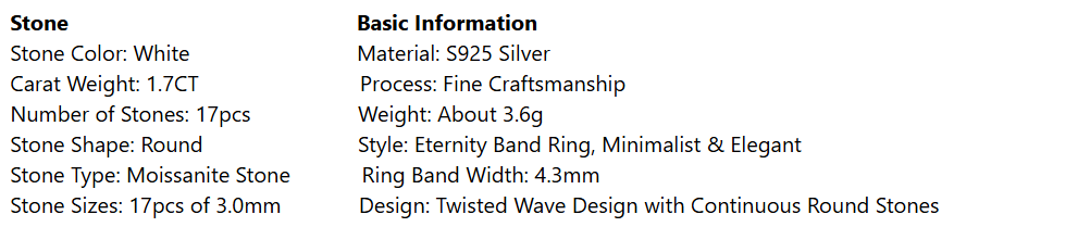 A symbol of endless connection and brilliance, this eternity band features a continuous twist of polished S925 sterling silver, set with 17 round lab-grown moissanite stones (1.7CT total weight). The fluid, wave-like design and uninterrupted sparkle create a mesmerizing effect that rivals natural diamond eternity bands, making it a perfect choice for anniversaries, stacking, or everyday luxury.
