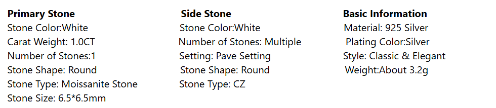 Classic Solitaire Design: The 1CT moissanite center stone is the star of the show, while the zircon halo and pavé band add an extra layer of sparkle and elegance, creating a timeless engagement ring silhouette.