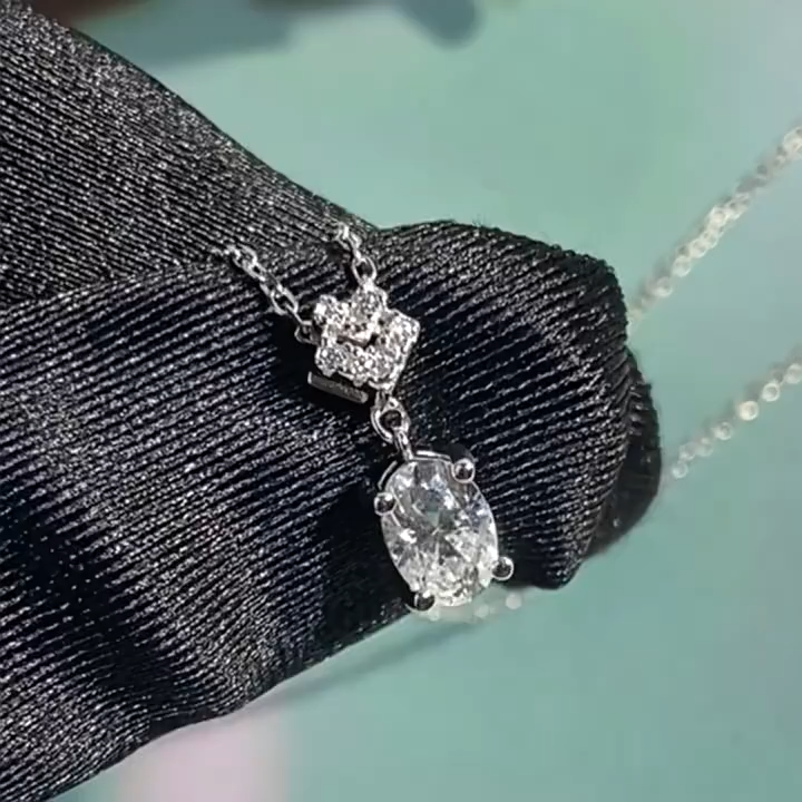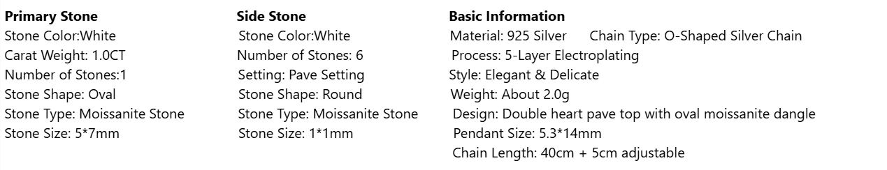 A delicate and elegant romantic necklace, this piece features a 5*7mm oval-cut lab-grown moissanite main stone (1.0ct), with a double heart-shaped top fully inlaid with small moissanite accents. Crafted from genuine S925 sterling silver with five-layer fine plating, the adjustable 40+5cm chain fits most necklines. It is an ideal choice for daily wear, dating, parties and gift-giving.