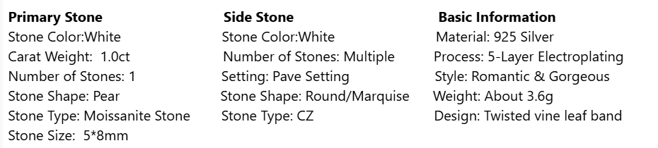 Embrace romantic elegance with a stunning pear-shaped halo design, this ring features a bright 1.0ct pear-cut moissanite at the center, surrounded by sparkling CZ stones in a delicate floral and crown-inspired band. Crafted from genuine S925 sterling silver with five-layer plating, it exudes soft, royal glamour — perfect for daily wear, weddings, dates and sentimental gifting.