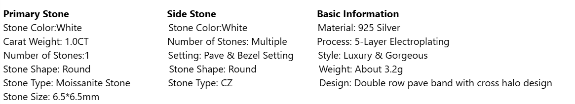 Premium Moissanite & CZ Sparkle: The 1CT main stone is high-quality lab-grown moissanite with vivid fire, clarity and diamond-like radiance. All side stones are high-brightness CZ, achieving a full-diamond luxury look with excellent cost performance.