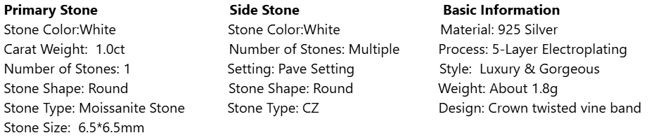 Inspired by elegant crown and twisted vine details, this delicate solitaire ring features a 1.0ct round brilliant moissanite at center, accented with sparkling CZ stones along the twisted band. Crafted from genuine S925 sterling silver with fine plating, it carries romantic and noble glamour, perfect for daily wear, proposals, weddings and sentimental gifting.