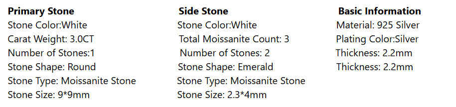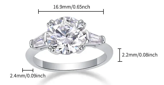 A timeless symbol of love, this three-stone ring features a 3.0CT round brilliant-cut lab-grown moissanite center stone (9.0mm), flanked by two tapered baguette-cut accent moissanites. Set in polished S925 sterling silver plated with 18K white gold, it delivers a classic yet bold sparkle that rivals natural diamonds, making it a perfect declaration of your lifelong commitment.