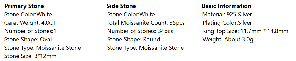 A breathtaking statement of luxury, this ring features a 4.0CT oval-cut lab-grown moissanite center stone (8*12mm), surrounded by a halo of 34 sparkling accent moissanites and a twisted pavé-set band. The elongated oval silhouette and double halo design create a jaw-dropping sparkle that rivals the most exquisite natural diamonds, making it a bold declaration of love.