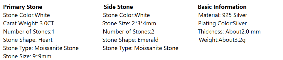 A romantic and bold expression of love, this ring features a heart-shaped lab-grown moissanite center stone (9*9mm), flanked by two tapered baguette-cut accent moissanites (2*3*4mm). Set in polished S925 sterling silver, the three-stone design creates a striking contrast of shapes and sparkle, making it a perfect symbol of your past, present, and future together.