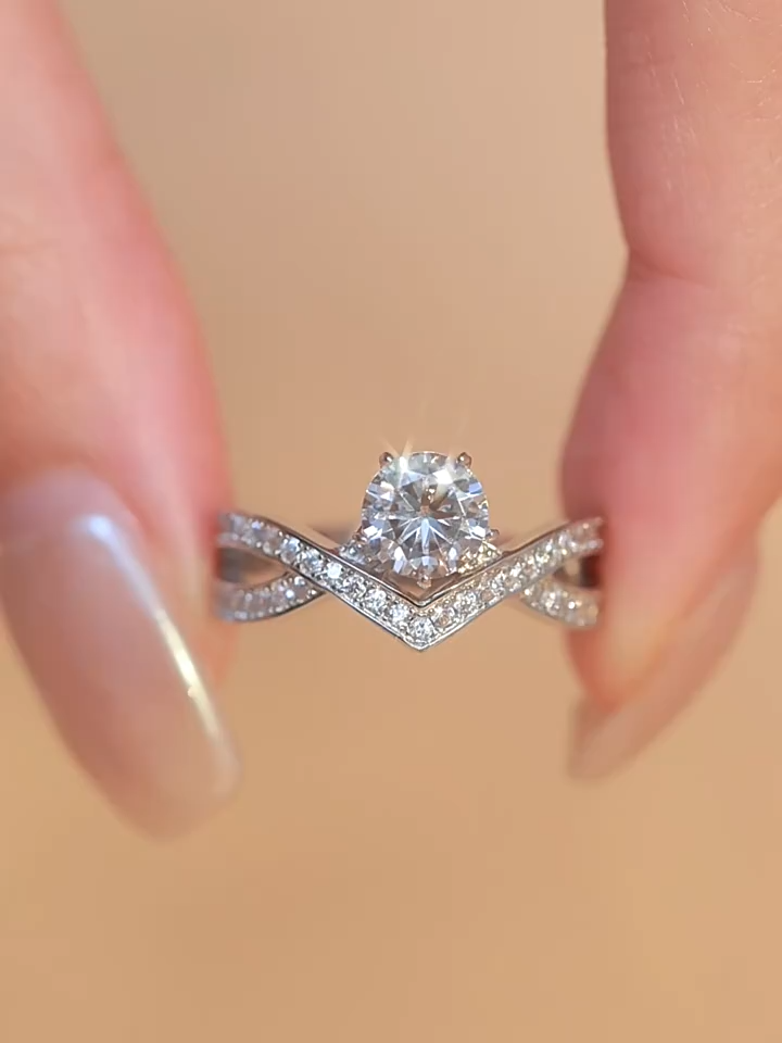 Angelic Design: The crisscrossing, pavé-set bands and 1-carat center stone create a regal, crown-like silhouette that feels both timeless and romantic.