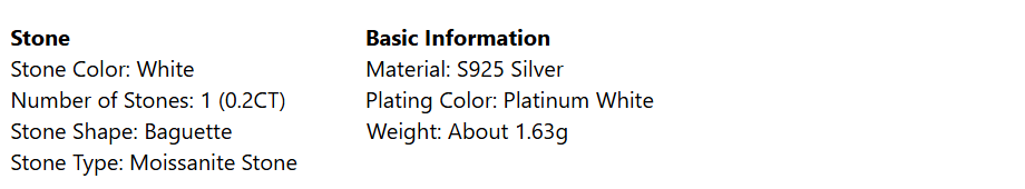Premium Moissanite Brilliance: The baguette-cut moissanite delivers a sophisticated, understated fire that rivals natural diamonds, ensuring lasting sparkle and clarity.