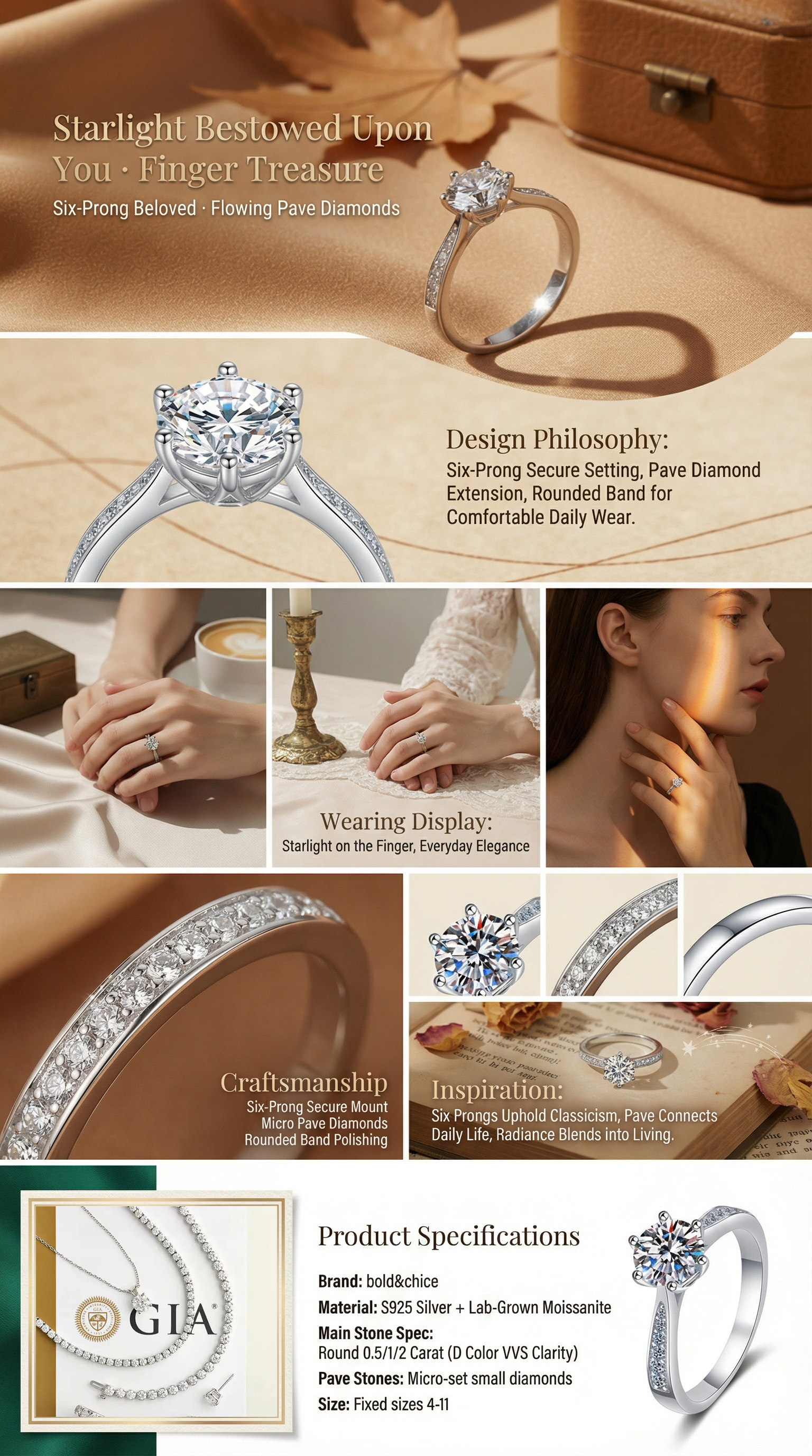 • Design & Material: Meticulously crafted from premium sterling silver, this ring features a radiant lab-grown moissanite centerpiece (fire/brilliance rivaling natural diamonds) paired with delicate matching accent stones along its streamlined band. The slim, smooth band ensures a comfortable fit across hand shapes.
